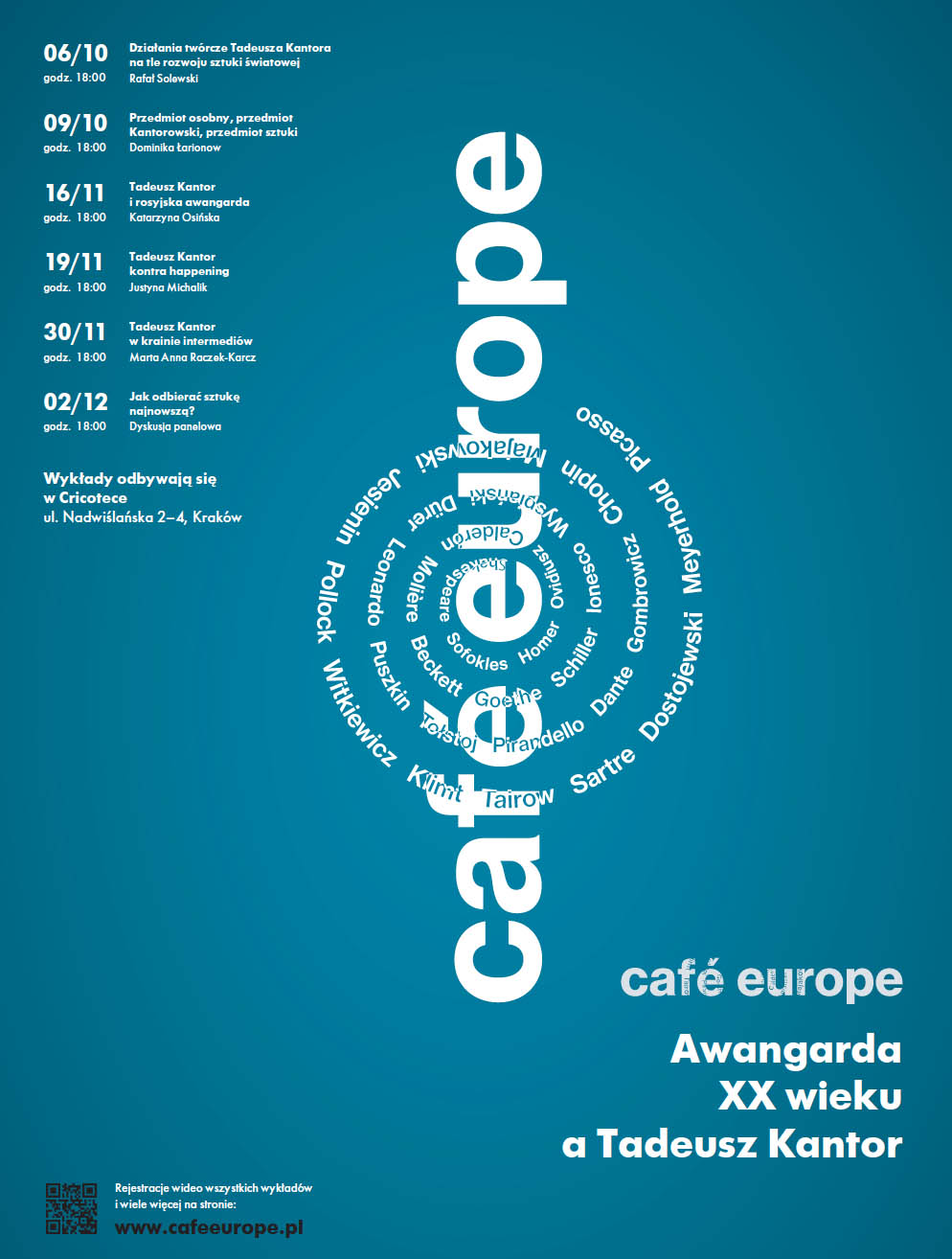 Tadeusz Kantor dorasta w czasie, kiedy w sztuce rozwijają się najważniejsze idee awangardowe XX wieku. Przez całe swoje życie artystyczne do awangardy się odwołuje – czerpie z niej, komentuje ją, a nawet „poprawia”, pisząc swoje własne „korekty” do założeń i postulatów poszczególnych „izmów”. Stąd już za życia przez jednych uważany jest za geniusza, a przez innych za mistyfikatora i zaledwie zręcznego naśladowcę. Trudno jednak nie zgodzić się z nim, kiedy w tekście zatytułowanym Café Europe pisze: Niezwykle naiwne wydają mi się powszechne dziś tendencje dzielenia Europy na Zachód i Wschód. Europa jest niepodzielna. Europa kultury. (…) Gdzieś na rozstajnych drogach Czasu musi istnieć „Café Europe”… kogo tam nie ma… To nierzeczywiste, „mentalne miejsce” umożliwiać ma twórczą wymianę myśli – bez barier, granic i czasu. Tylko dzięki temu – zdaniem artysty – sztuka może się rozwijać. Cricoteka zaprasza na cykl spotkań, podczas których o twórczości Tadeusza Kantora w kontekście awangardy XX wieku opowiadać będą znawcy historii sztuki i teatru. Chcemy tym samym wprowadzić w życie to, co niegdyś wyraziła Krystyna Czerni, pisząc, że na kartach artystycznej biografii Tadeusza Kantora można uczyć się historii sztuki współczesnej – jej odkryć i złudzeń, jej poszukiwań i ambicji.