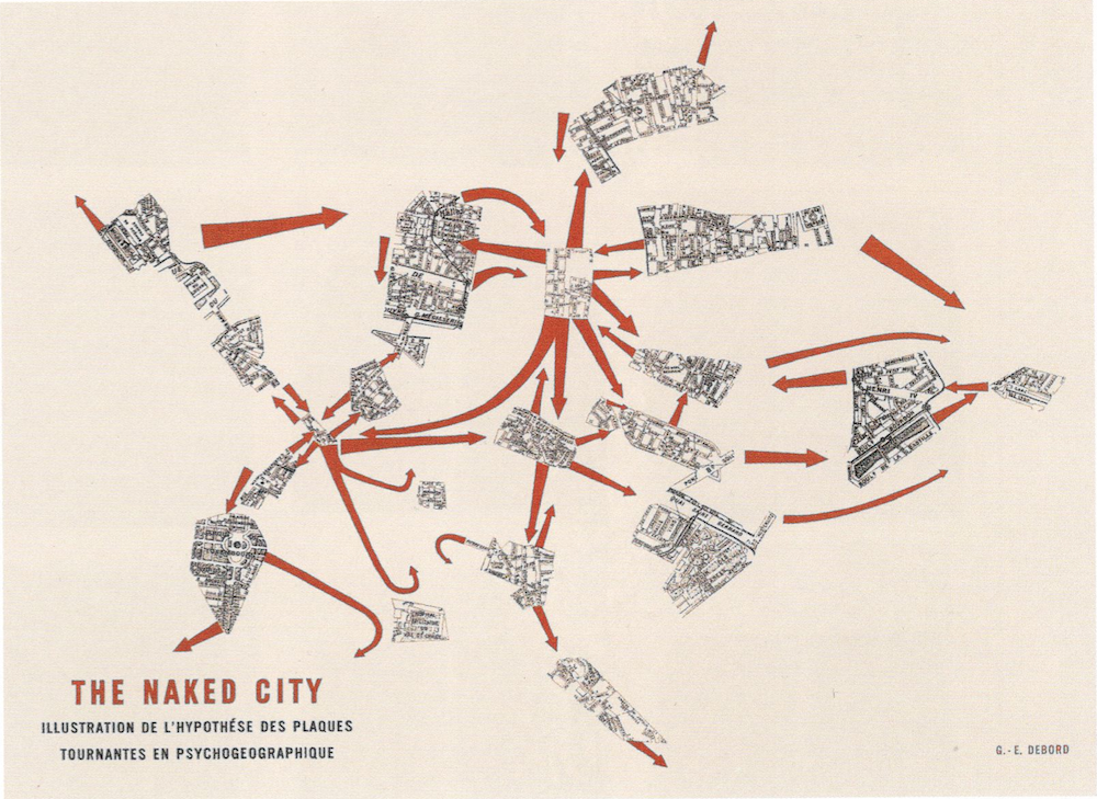 Przewodnik dla dryfujących prowadzi czytelników szlakiem, który przetarli dawni psychogeografowie z Międzynarodówki Letrystycznej i Sytuacjonistycznej – od pierwszych eksploracji (i modyfikacji) przestrzeni miejskich aż po rewolucyjną krytykę urbanistyki. Ostatnia część poświęcona jest manifestom architektów, którzy „otarli się” o Międzynarodówkę Sytuacjonistyczną i w swojej pracy pozostawali pod wpływem Guy Deborda, Constanta oraz innych miejskich poszukiwaczy przygód.